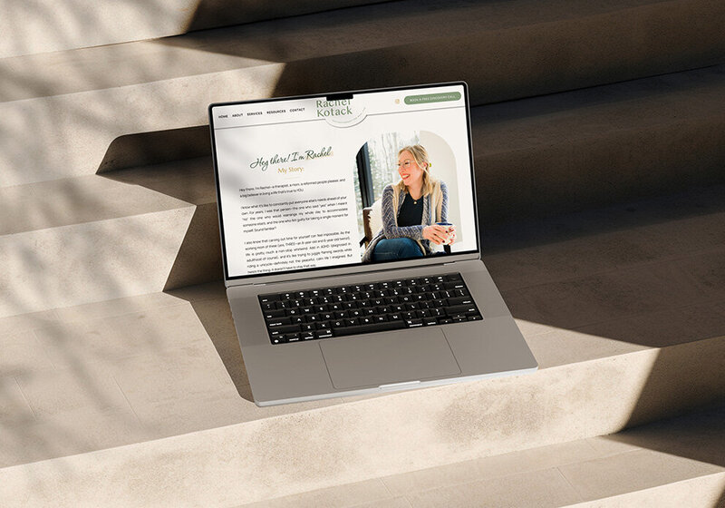 The design pairs a calming, uncluttered layout with thoughtful pops of personality—reflecting Rachel’s grounded nature and playful spirit. A sage-toned palette and soft, approachable fonts bring a sense of ease, while intentional whitespace makes the site feel open and easy to navigate. Subtle movement and layered textures mirror the depth of the work she does—complex, but never chaotic.