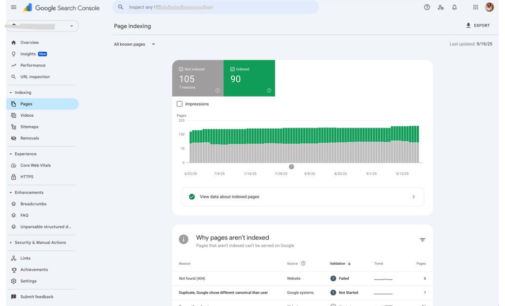 - Pages not indexed – check Coverage Report; confirm pages aren’t “noindex”